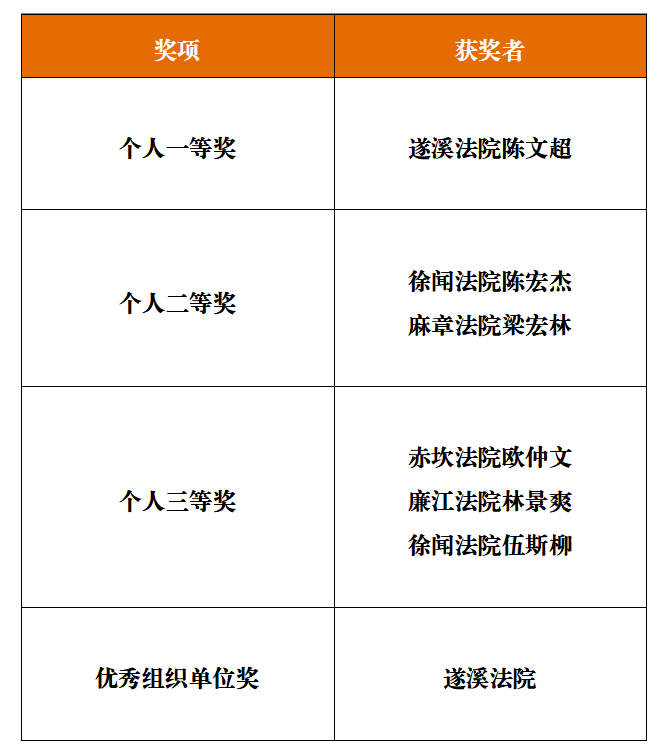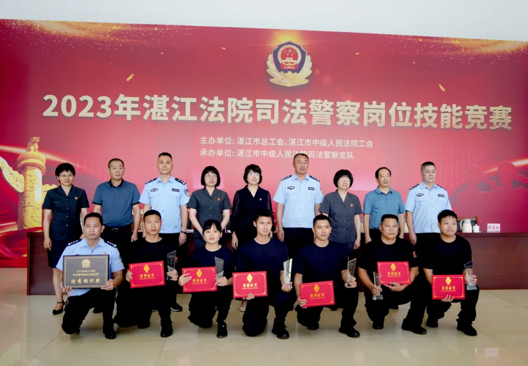 为进一步提高司法警察体能素质和警务技能,推进湛江法院司法警察执法规范化建设,激励干警竞标争先、比学赶超,在广东省高级人民法院法警总队、湛江市直机关工委和湛江市总工会的大力关心支持下,8月30日,2023年湛江法院司法警察岗位技能竞赛(决赛)在湛江中院顺利举行。 湛江中院从7月以来组织开展本次竞赛,分初赛和决赛两个阶段进行。全市各赛区法院严格选拔程序,规范组织初赛,最终22名法警从142名参赛法警中脱颖而出,进入决赛。 决赛现场主要考核擒敌拳、安全检查、执行绳捆绑、百米障碍组合、轻武器分解与结合等5个项目。在比赛中,参赛干警精神饱满、动作规范,充分展现了湛江法院司法警察的精气神。 湛江中院坚持将技能竞赛作为培养锻炼青年干警、加强队伍建设的基础性工程,开展岗位练兵、岗位技能竞赛已成常态。本次法警竞赛旨在贴近实战,开展岗位练兵,展示新时代湛江法院司法警察新风貌,营造以赛促学、以赛促能、以赛促用的良好氛围,引领广大司法警察勤练善学、爱岗敬业、忠诚履职。 湛江中院党组成员、副院长李非白: 举办司法警察岗位技能竞赛,是湛江法院司法警察实战化训练成果的大检验,是全面展示湛江法院司法警察队伍风貌的大阅兵。 湛江市总工会党组成员、副主席李晖: 希望湛江中院充分发挥工会组织的作用,坚持以赛赋能、以赛育人、以赛提质,锻造一支忠诚干净担当的法院铁军。 广东高院法警总队副总队长李春成: 湛江法院近年来的司法警务工作应予肯定,希望广大司法警察以此次岗位技能竞赛为契机,进一步推进司法警务规范化建设,肩负起时代赋予的光荣使命。 湛江中院有关部门负责人和干警代表、各基层法院代表共100余人现场观摩了竞赛。 获奖名单