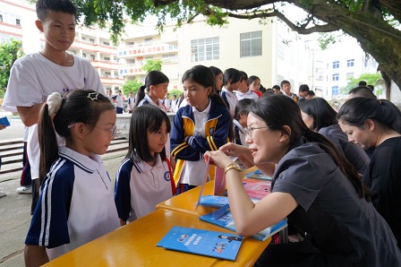 随后,法院干警在校园榕树下搭起了普法摊位,向学生们派发预防未成年人犯罪、校园欺凌、防毒禁毒等普法读本,与学生们积极互动,为他们解疑答惑。
