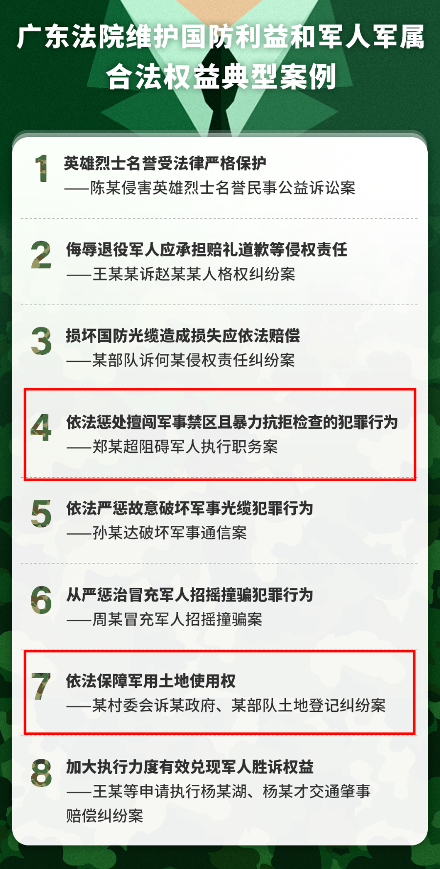 “八一”建军节前夕,广东省高级人民法院发布一批维护国防利益和军人军属合法权益典型案例,包括坚决维护英雄烈士及退役军人名誉、荣誉,依法惩治冒充军人招摇撞骗、阻碍军人执行职务等犯罪行为,以及充分保护部队军用土地使用权等。 04 依法惩处擅闯军事禁区且暴力抗拒检查的犯罪行为 ——郑某超阻碍军人执行职务案 基本案情 郑某超驾驶快艇经过军事禁区附近海域时,擅自闯入军事禁区。部队发现后派战士驾驶巡逻艇靠近,准备进行识别查证。郑某超因担心其携带的违规渔具被查扣而调头逃窜,被战士截停并登临检查时,郑某超推拉战士致其落海后逃跑。之后,郑某超主动投案,如实供述其暴力阻碍军人执行职务的犯罪事实,并表示自愿认罪认罚。 裁判结果 湛江市中级人民法院经审理认为,郑某超以暴力阻碍军人依法执行职务,构成阻碍军人执行职务罪,应依法惩处,因其自动投案,如实供述自己罪行且自愿认罪认罚,依法可从宽处理,判处其拘役二个月。 典型意义 依法执行职务是军人捍卫国家、维护发展、保卫人民的重要方式。阻碍军人依法执行职务是侵害国家和国防利益的行为,必须依法惩处。本案中,法院坚持惩教结合,加强认罪悔罪教育,强化军地沟通,促使被告人自愿认罪悔罪,通过司法手段小惩大诫涉军轻微刑事案件被告人,为军队履行使命任务提供有力司法保障。 07 依法保障军用土地使用权 ——某村委会诉某政府、某部队土地登记纠纷案 基本案情 某村委会向法院提起行政诉讼,主张依据政府对其与案外村之间的权属争议所作处理决定,某政府向某部队核发的涉案《国有土地使用权证》包含了其使用的土地,请求撤销该《国有土地使用权证》。 裁判结果 湛江市中级人民法院经审理认为,政府已向某部队核发涉案《国有土地使用权证》,且涉案土地一直由某部队管理使用。根据现场勘查,某村委会主张的土地并不在涉案《国有土地使用权证》证载范围内,依法裁定驳回该村委会的起诉。广东省高级人民法院二审驳回上诉,维持原裁定。 典型意义 军用土地是保障部队战备、训练的重要物质基础。涉军用土地纠纷既涉及到国防军事权益,也关系到军地关系和谐,依法妥善处理好军用土地权属纠纷是法院服务保障国防建设大局的重要职责。本案注重法律程序正当性,法院通过现场勘察,充分调查事实,明确认定原告起诉不符合法定条件应予驳回,确保军用土地权属关系稳定,促进军民关系和谐发展。