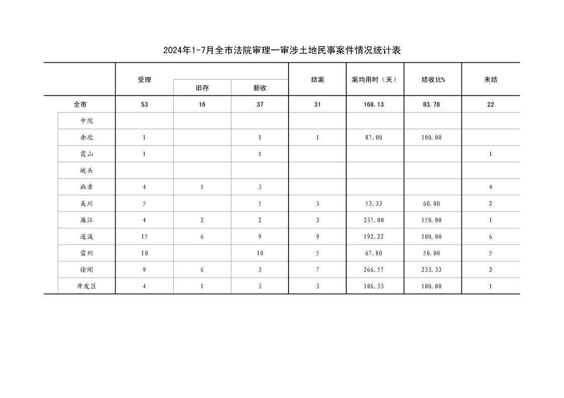 2024年1-7月全市法院审理一审涉土地民事案件情况统计表