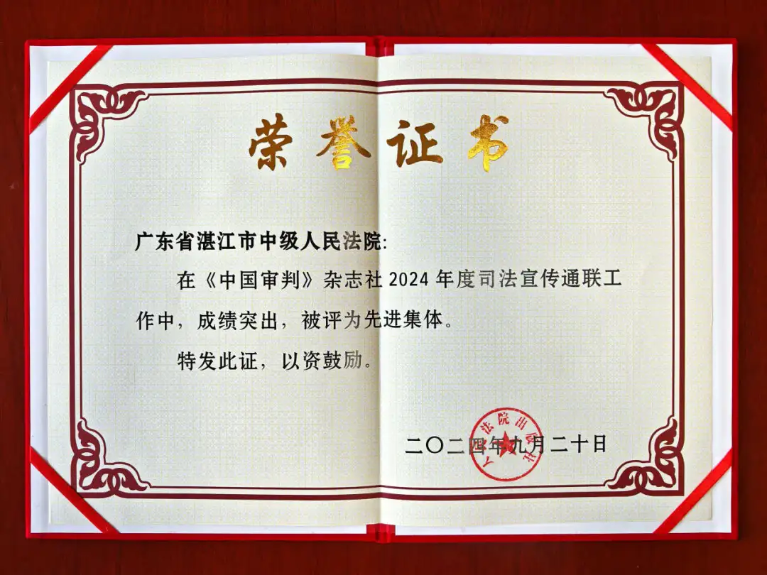 近日,《中国审判》杂志社召开司法宣传工作推进会,对在2024年宣传通联工作中取得突出成绩的先进集体和个人进行表彰。其中,湛江中院获评《中国审判》“2024年度司法宣传通联工作先进集体”荣誉称号。至此,湛江中院已连续三年获此荣誉。 近年来,湛江中院始终坚持以习近平新时代中国特色社会主义思想为指导,深刻领悟“两个确立”的决定性意义,增强“四个意识”、坚定“四个自信”、做到“两个维护”,把法治宣传教育落实到法院工作的全过程和各方面,从加强宣传工作制度建设、提升宣传队伍能力、创新优化宣传方式途径等各个方面,全方位提升宣传工作成效,法院工作的传播力、引导力、影响力、公信力不断提升。 下一步,湛江法院将进一步密切与《中国审判》杂志社的沟通交流,树牢为审判执行工作服务的主动意识,守牢意识形态阵地,加强舆论引导,强化选题策划,关注法治热点,讲好中国法治好故事,传播中国法治好声音,积极发挥新闻宣传工作在促进法治建设中的作用,为奋力推进司法审判工作现代化提供坚强思想保证和强大精神力量。