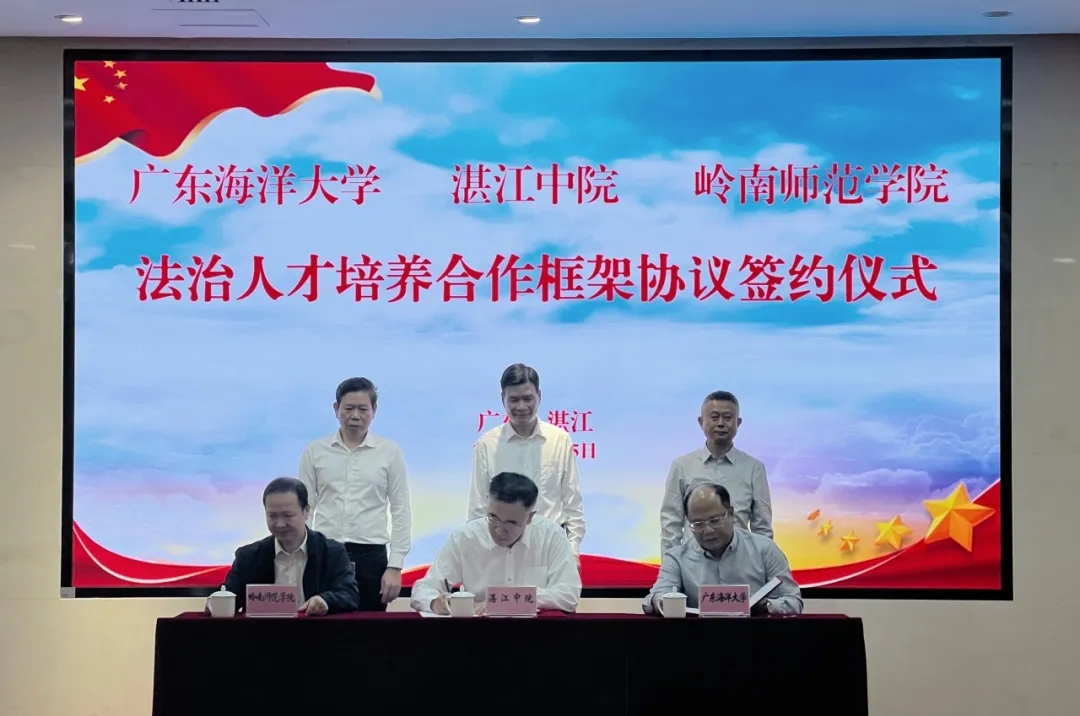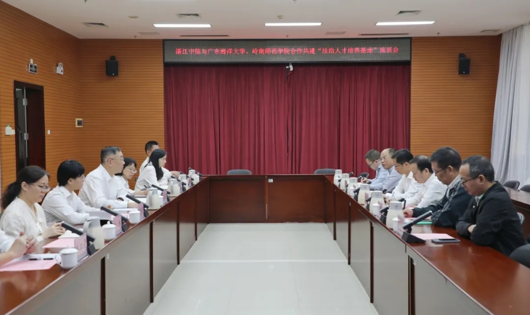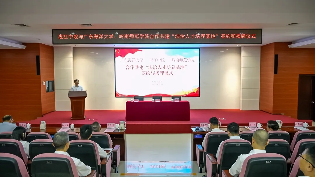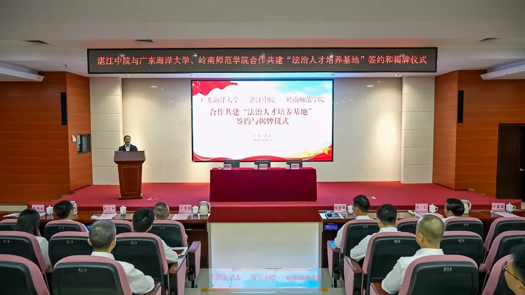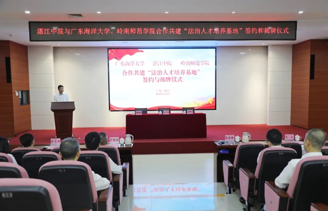 “湛江法院拥有丰富的案例资源,能大大促进我们法学教育研究工作……” 仪式上,湛江中院、广东海洋大学、岭南师范学院领导分别致辞,表达了对合作共建“法治人才培养基地”的高度期待和坚定信心。大家纷纷表示,本次院校共建既是深入贯彻落实习近平法治思想和习近平总书记关于做好新时代人才工作的重要思想,全面贯彻落实党的二十大和二十届二中、三中全会精神的有力举措,也是以高水平理论研究、高质量法律实务促推法治建设的生动实践。 随后,在卢景团、龙卫、张坚雄的见证下,湛江中院、广东海洋大学和岭南师范学院签署了合作协议,市委组织部、市委政法委、湛江中院与两所高校共同为“法治人才培养基地”揭牌。 仪式结束后,与会领导及嘉宾开展了座谈会。会上,三方就法治人才培养、法学研究、实践教学等方面展开了深入交流,围绕法学课题合作、“湛法讲堂”进高校、法律实习生培养等具体举措落实畅所欲言。根据合作框架协议,湛江中院与广东海洋大学、岭南师范学院将在三方面开展协作。 一是强化法治人才培养。依托共建基地、“湛法讲堂”等平台,推动拥有扎实法学理论基础和专业研究水平的高校教师进入法院讲授专业研究成果,也选派优秀审判人才到海大、岭师兼职任教,将实务经验和生动案例带进课堂教学中,促进各方相互交流、取长补短。 二是深化法学研究合作。定期举办法治领域理论与事务研讨活动,充分发挥法院审判资源和高校理论智库的优势,联合开展专题研究、开展新课题探索,推动法治理论创新与发展。 三是丰富法学实践教学。为在校学生提供旁听庭审、组建模拟法庭等项目必要的资源支持、实训竞赛指导,以及丰富的实习实践机会,通过指导撰写文书、案例分析、组织普法志愿活动等举措,帮助学生将课堂所学转化为解决实际问题的能力本领。 此次活动积极响应落实了湛江市委、市政府关于新时代法治人才培养工作部署及市委人才工作领导小组关于人才工作提质年的工作要求,接下来,湛江法院将携手广东海洋大学、岭南师范学院不断探索院校共建新模式,共同推动法学教育与司法实践的深度融合,共促法治湛江建设!