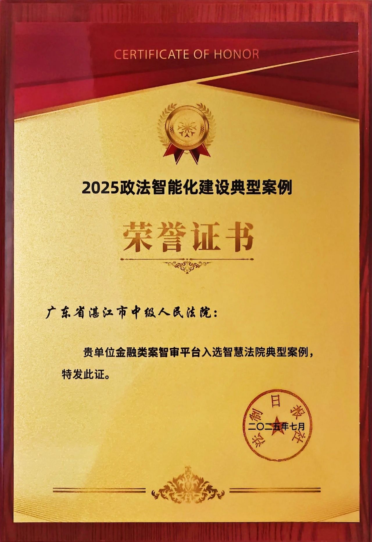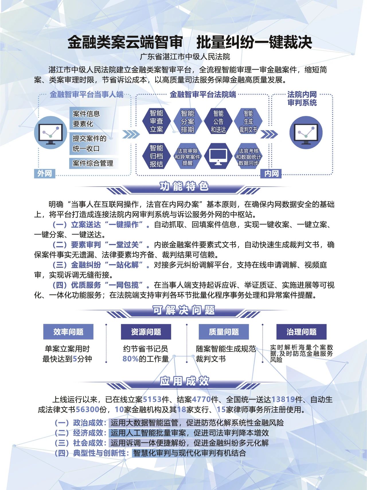 近日,由法制日报社主办的2025政法智能化建设案例及论文征集宣传活动颁奖仪式在北京召开。本次活动共评选出智慧治理、智慧法院、智慧检务、智慧警务、智慧司法典型案例各10个、创新案例各20个、创新论文各30篇。 湛江中院金融类案智审平台入选 全国智慧法院典型案例! 当天下午,湛江中院还受邀参加全国政法智能化建设成果展,就“湛江法院构建‘四智工程’推动数字司法全面升级”作经验分享。